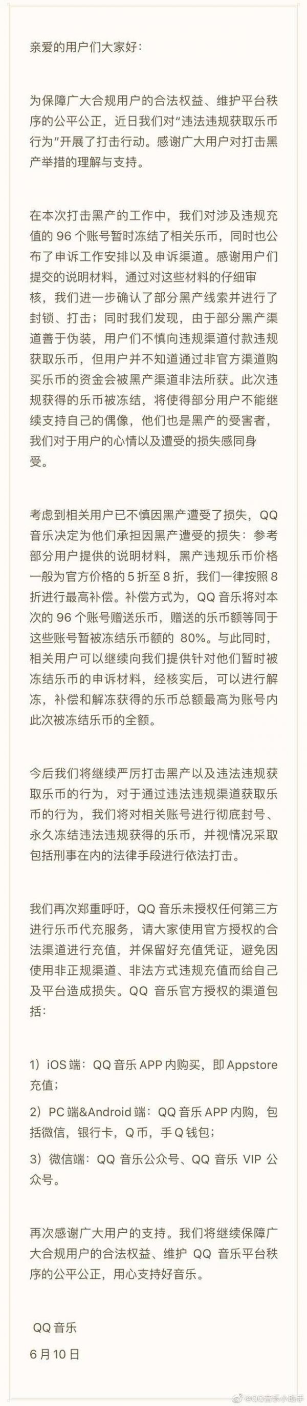 @新浪科技【QQ音乐就乐币事件再发声明:未授权第三方代充服务】6月10日晚间消息,针对打击“违法违规获取乐币”一事,QQ音乐发布进一步说明,再次呼吁使用官方授权的合法渠道进行充值,称未授权任何第三方进行乐币代充服务。6月6日,QQ发布公告称,经后台系统监测,发现部分用户存在违规获取乐币的异常行为,侵犯平台合法权益,将对通过未经授权的任何渠道或利用违法违规违反服务协议的方式(包括但不限于利用支付漏洞等)获取乐币的行为进行严厉打击。