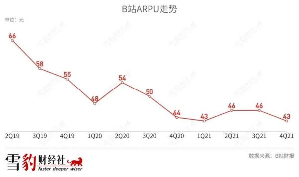 不过另一方面,B站用户也越来越“抠”。2021年四季度ARPU为43元,环比、同比双降(三季度为46元、而2020年同期为44.3元),这一数字也随着MAU的增高而一直下降。2019年,B站MAU刚刚破亿时,ARPU高达60多元。