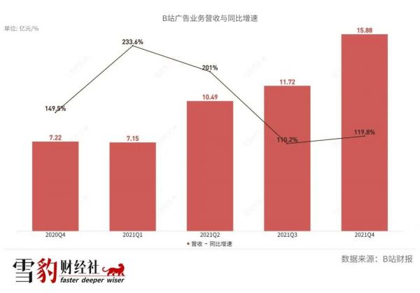广告营收增速明显,一部分原因得益于其作为B站刚刚兴起的业务板块,基数较小。2021年四季度B站广告收入15.87亿元,首次超过B站曾经起家的游戏业务,坐上营收贡献第二把交椅。