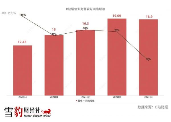 目前对B站营收贡献最大的依然是增值业务,2021年四季度及全年,该业务占比分别为32.7%及35.78%。不过增值业务的增速也开始明显放缓,2021年四季度B站增值服务营收同比增长52%,去年同期则为118%,增速腰斩。