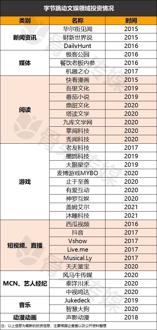 首先,通过一系列投资和自己下场做已经在网文和漫画上有了一定的内容储备。从字节过去的投资记录来看,文娱赛道一直都是最受字节关注的,而在对文娱赛道的投资中,阅读类的项目又一直是字节关注的重点。字节对阅读赛道的投资自 2019 年开始变得更加频繁,根据骨朵网络影视此前的报道,2019 年至 2021 年这段时间里,字节一共投资了 7 个阅读类的项目。