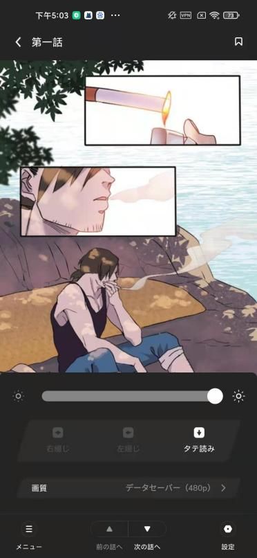 在阅读界面,Fizzotoon 的设计也是简洁但是功能齐全。用户可以通过目录选择想看的章节、跳转至下一章节或跳回上一章节以及在阅读过程中调整漫画的画质、亮度等。