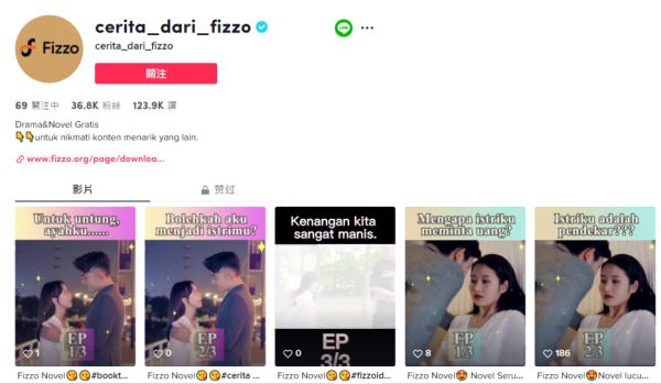 举个例子,字节去年上线的网文阅读 App Fizzo 除了买量以外,也是选择了 TikTok 来做营销。目前 Fizzo 在印尼的官方账号已经有了 3.6 万的粉丝量,内容以 20 秒小短剧为主。这种小短剧的形式制作成本不算太高但有更好的转化,这一点在国内也有验证。