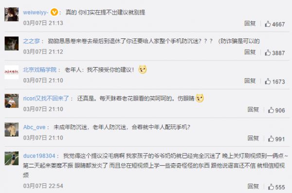 “未成年防沉迷,老年人防沉迷,合着就中年人配玩手机?”一位网友质疑道,如果中年人沉迷短视频,是不是也应该上线中年人防沉迷模式?