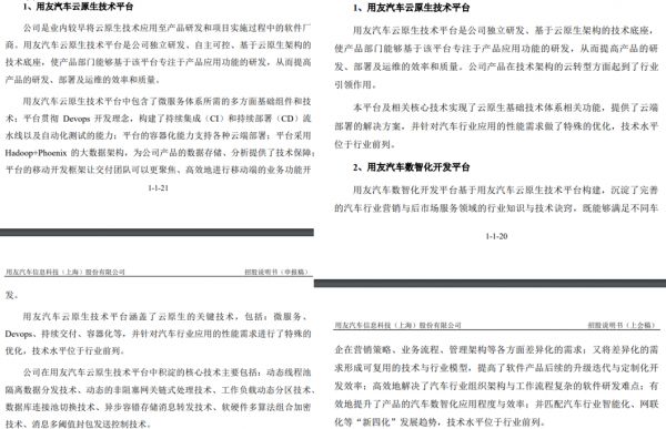 在招股书申报稿中,用友汽车称公司利用云计算、大数据等新一代信息技术,自主研发出了多项先进的核心技术,形成了公司的两大研发平台:用友汽车云原生技术平台和用友汽车数智化开发平台。