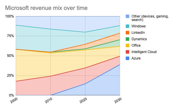 微软是一家个人电脑公司,而亚马逊则是一家网络零售商。这一事实表明,从哪里出发几乎没有关系。能不能驾驭云计算的增长浪潮才是真正重要的事情。微软内部可能有太多的利益争斗,还不能大方承认自己已经成为 Azure公司,但到了 2020 年代后期之后,情况应该就很清楚了。
