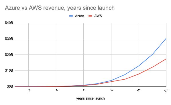 Azure 是不是有史以来最快达到 100 亿美元收入的 B2B 产品呢? Azure 让过去 25 年来发展最快的软件公司都相形见绌:
