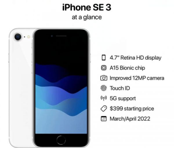 关于iPhone SE——售价为429美元起,人民币3499元起;搭载iPhone 13系列的A15仿生芯片;颜色有午夜色、星光色和红色;4.7寸视网膜高清显示屏;与iPhone13系列背板相同的玻璃;支持TouchID;支持5G。