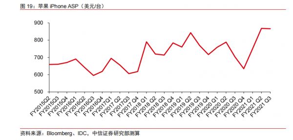 iPhone的平均售价小幅稳步攀升,据中信证券数据,从2015年Q2的660美元/个,提升至2021Q2的866美元/个,近五年来iPhone的平均售价提升幅度约31.2%。