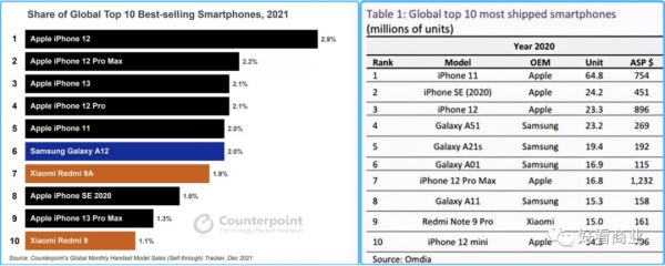 据Counterpoint的数据,2021年,全球智能手机出货量为13.9亿台;全球前十大畅销手机中,iPhone SE二代仅排名第八,市场份额1.6%。