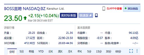 Boss直聘美股涨超10% 该公司拟回购1.5亿美元股票