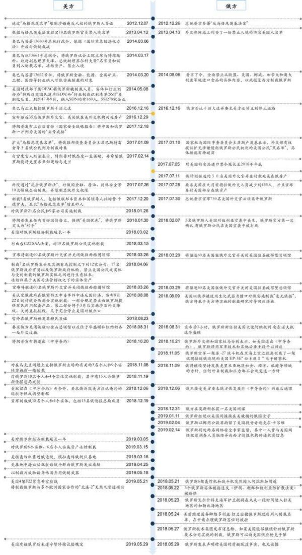 目前美国已经制裁上百名俄罗斯个人和实体,对俄罗斯的经济制裁和食品禁令也不断延期,去年又因为英国公民谢尔盖·斯克里帕尔毒杀案追加对俄罗斯制裁,接着宣布对俄罗斯外交降级、限制俄罗斯对美出口、关闭俄美直航航线,又退出《中导条约》,并利用军事武器、通过军演或用战机在俄边境制造紧张局势。