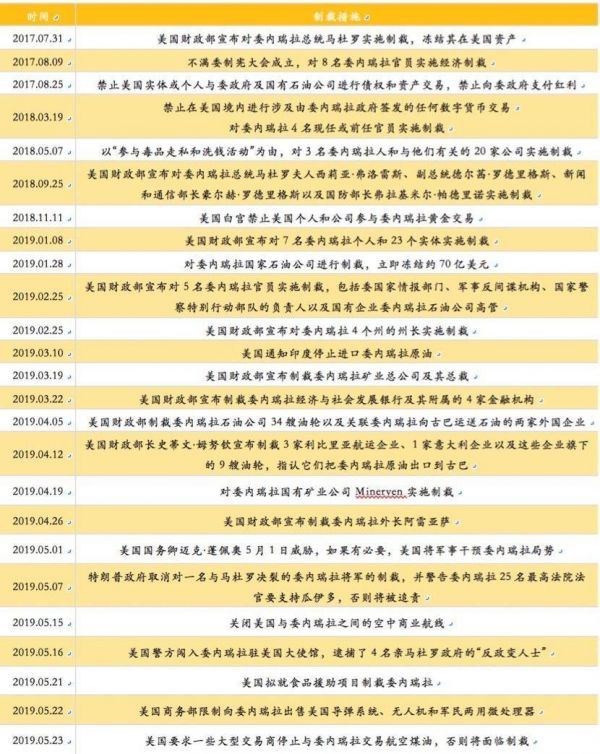 对委内瑞拉,外交、经济和金融全面制裁。美国多次制裁委内瑞拉石油公司及外交人员,限制美国企业或个人参与委内瑞拉金融交易,包括委内瑞拉政府或石油企业的债券和债权和资产、数字货币和黄金交易。今年委宣布断交后,开始制裁委石油及航运公司、禁止印度进口委石油、多轮制裁委个人和实体、限制其他国家和委内瑞拉进行石油交易。