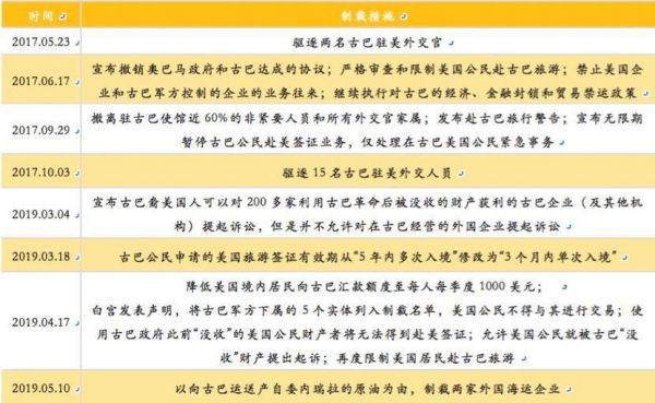 对古巴,重启制裁法令,经济、金融和外交全面制裁。美国撤销了奥巴马时期达成的协议,重启古巴的经济、金融封锁和贸易禁运政策,禁止美企和古巴合作,限制美国公民赴古巴旅游,又收紧古巴人赴美签证政策,不断驱逐古巴驻美外交人员,最近又启动伯顿法第三条,古巴裔美国人可以对200多家利用古巴革命后被没收的财产获利的古巴企业(及其他机构)提起诉讼。