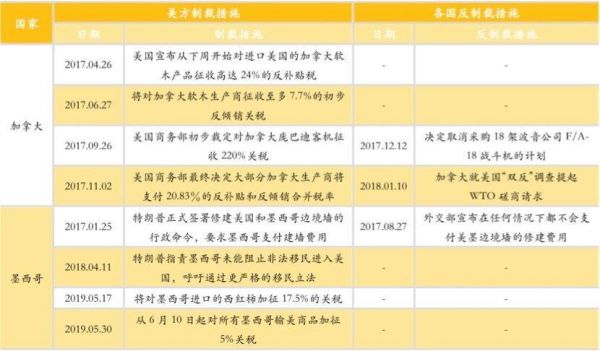 对加拿大,加征关税和收紧海关政策。美加的软木贸易纠纷已经持续30多年,特朗普上台后就加拿大软木征收“双反”,对各公司差异化征税,反补贴税率加权平均值为14.25%,反倾销税率加权平均值为6.58%,总税率加权平均值为20.83%,并对庞巴迪征收220%高额关税。