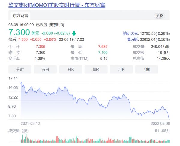 一方面,陌陌母公司在美股市场上的成绩并不理想。2018年6月以后,在纳斯达克交易所上市的陌陌股价就从最高点48.766美元一路下跌,直至跌破发行价再次探底。截至发稿日,陌陌的股价为7.3美元,总市值为14.38亿美元。
