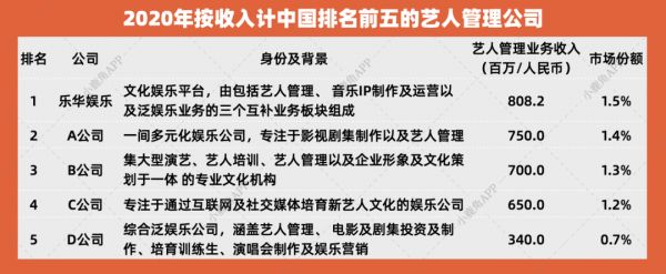 截至2020年12月31日,该市场有超过1200家参与者。虽然艺人管理公司众多,但能出道成名的艺人甚少,少数头部艺人的收入占据了行业收入的大部分,头部公司的收入更是完全依赖艺人的发展。例如,乐华近三年的艺人管理收入从5.3亿元增长至11.7亿元,与王一博、程潇等头部艺人的爆红不无关系。