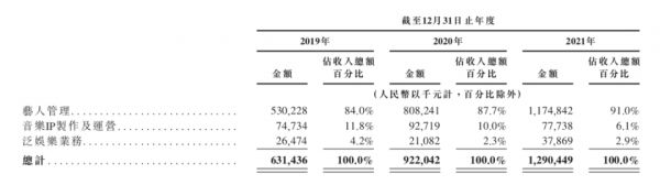 随着乐华的业务朝多元化发展,总收入连年增长,艺人管理业务在总收入中也占据着越来越高的份额。2019年-2021年乐华娱乐艺人管理收入占比分别为84.0%、87.7%、91.0%,乐华娱乐的绝大部分收入都来自艺人。