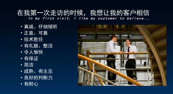 首先,我们要让客户相信我的公司是安全可靠、有经济保证、有经验、有荣誉,并且为了获得公司目标而具有合作精神的。
