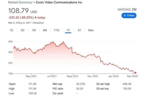 作为疫情期间的最大赢家的远程会议软件Zoom,最近也是兵败如山倒。在疫情的刺激下,Zoom从不到约80美元/股一路攀升到了560美元/股,市值一度突破千亿美元,成为了过去两年中势头最强劲的科技股。