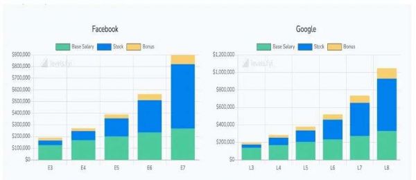 Meta和谷歌各级别工程师的收入构成情况,图片来自Levels.fyi