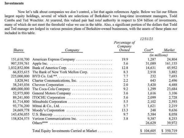 在股东信里巴菲特指出,收益主要来自于四大业务的投资,包括保险业务、BNSF铁路业务、BHE能源业务以及对苹果公司的投资。截至去年年底,伯克希尔前10大持仓包括苹果、美国银行、美国运通、可口可乐、穆迪、威瑞森、美国合众银行、比亚迪、雪佛兰和纽约梅隆银行。