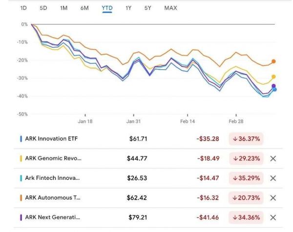 成长型科技股跌得这么惨,收割的也不仅仅都是散户。比如在疫情期间被捧上神坛的方舟基金掌门人、新晋女股神“木头姐”,今年以来也损失惨重。