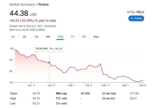 在这次暴跌中,前段时间刚站上风口、备受追捧的元宇宙也难逃血洗命运。有“元宇宙第一股”之称的沙盒游戏平台Roblox,经历了元宇宙概念的大火之后,股价一路暴涨推动市值接近800亿美元。而在过去不到3个月的时间里,Roblox已经累计下跌55%,市值距离高点已经缩水了约500亿美元。