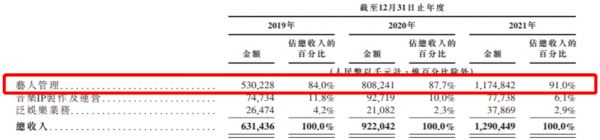 艺人管理收入为公司的主要收入来源,2019年、2020年分别占据了总收入的84%和87.7%,2021年,该比例更是达到了91%。这意味着,乐华娱乐受旗下艺人影响很大,艺人的变动都将直接影响公司整体业绩。