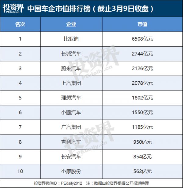 从市值而言,新能源汽车已经霸榜中国车企排行前列。截止3月9日收盘,位列国内车企市值第一的为新能源汽车巨头比亚迪,市值高达6508亿元;而蔚来则紧紧跟随在长城汽车之后高居第三位,理想、小鹏分列第五、六位,超越了广汽集团、吉利汽车等一众传统车企。