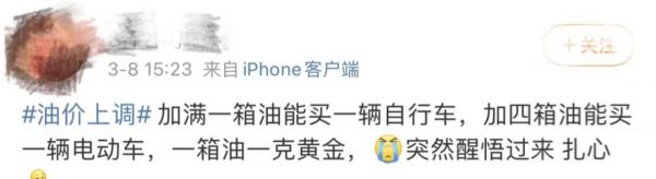 天平的另一端是,油价暴涨开始牵动了大家价格神经。眼下国际原油持续飙涨,3月8日是10个工作日统计周期的第3个工作日,原油变化率24.01%,预计上调油价1040元/吨左右,已远超上调红线,折合升来看,约为0.78-0.94元/升的涨幅。