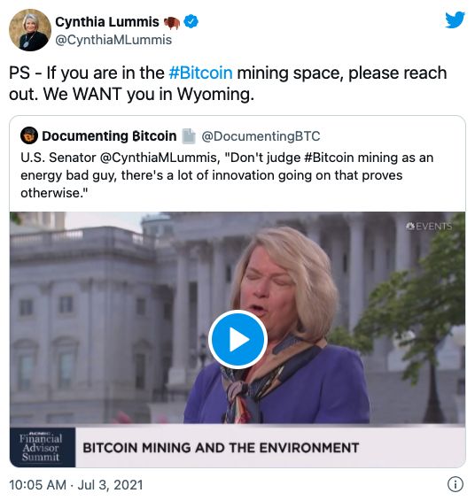 去年,Cynthia Lummis发布推特,盛情邀请比特币矿工前往怀俄明州工作: