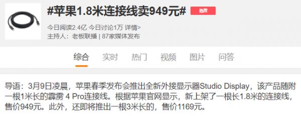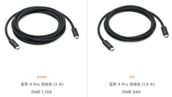 随后,苹果官网同步上架了一根1.8米的雷雳4Pro连接线,售价949元。此外,苹果还将在未来推出3米的连接线,售价达1169元。