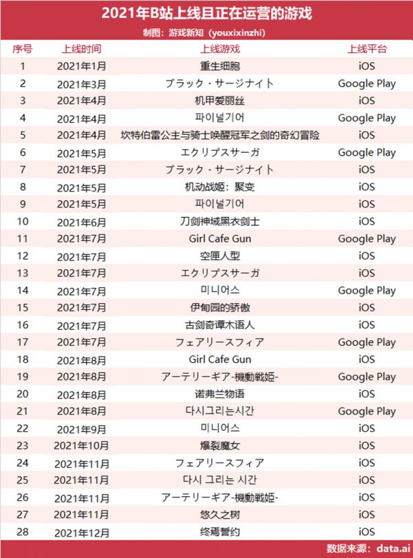 在刚发布的2021年业绩报告中,B站提到2021年第四季度由于新推出的移动游戏大受欢迎,收入较2020年同期增加15%。但七麦数据显示,B站2021年上线且还在运营的21款游戏(不同平台记作1款)中,仅有《坎特伯雷公主与骑士唤醒冠军之剑的奇幻冒险》(中国市场)与《미니어스》(韩国市场)能稳定保持在iOS畅销榜Top200。从这点上也可以看出B站在2021年游戏业务上并没有太大的突破。