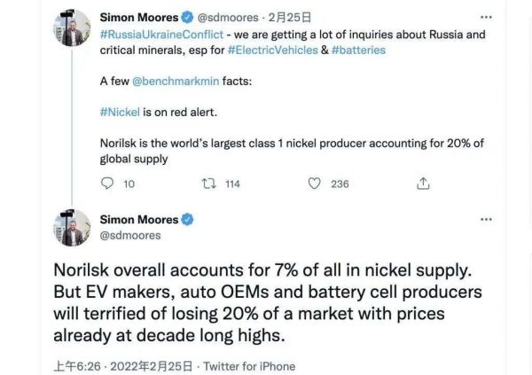 加上目前俄乌冲突的局势尚未明朗,未来如果恶化,有可能会对全球范围内镍的供应产生更大的影响,镍价更会随之上升,电动汽车的成本自然也要承受不小的压力。
