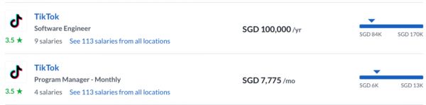 Glassdoor是一家做企业点评与职位搜索的职场社区公司。记者查询Glassdoor了解到,Shopee、TikTok位于新加坡的软件工程师月薪为6500~7775新币,亦有程序员向记者表示,其月薪超过8000新币。