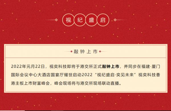 文内称,2022年元月22日,视奕科技即将于港交所正式“敲钟”上市,并同步在福建•厦门国际会议中心大酒店国宴厅耀世启动2022“视纪盛启•奕见未来”视奕科技“香港”主板上市财富峰会,而且,“峰会现场将与港交所现场联动直播”。