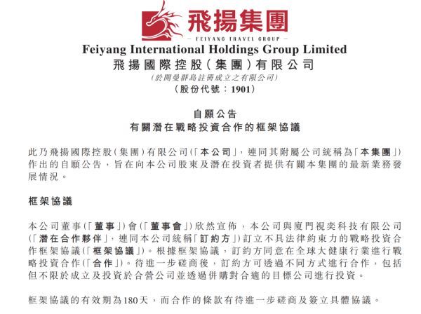 今年2月10日,飞扬集团公告称,其与视奕科技订立不具法律约束力的战略投资合作框架协议。根据协议,订约方同意在全球大健康行业进行战略投资合作。待进一步磋商后,订约方可透过不同方式进行合作,“包括但不限于成立及投资于合营公司并透过并购对合适的目标公司进行投资”。框架协议的有效期为180天,而合作的条款有待进一步磋商及签立具体协议。