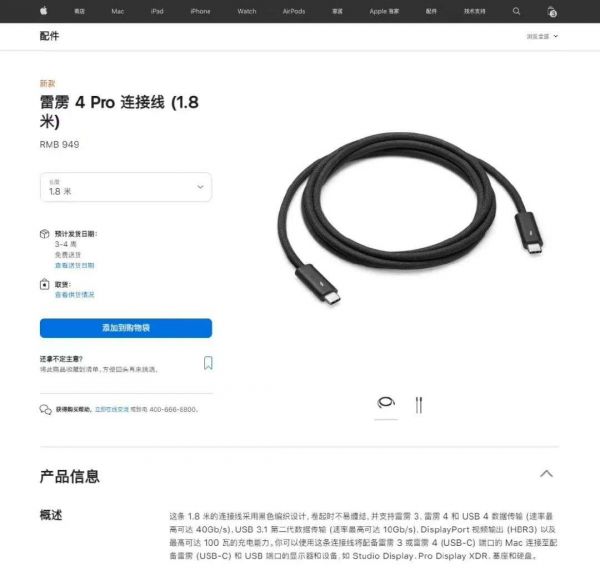 3月9日凌晨,苹果春季发布会推出全新外接显示器Studio Display,该产品随附一根1米长的雷雳 4 Pro连接线。根据苹果官网显示,新上架长1.8米的雷雳4 Pro连接线,售价949元。此外,还即将推出一根3米长的,售价1169元。(凤凰网科技)