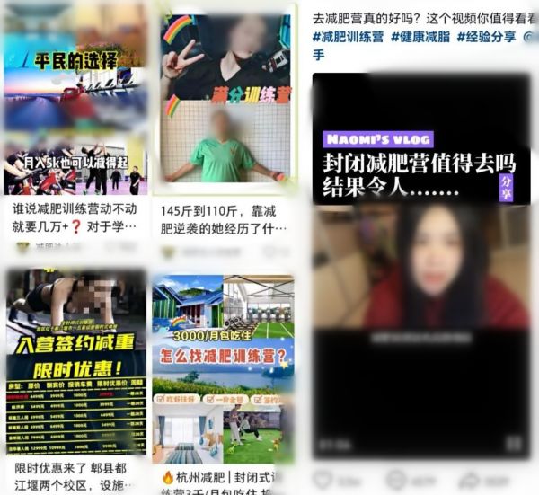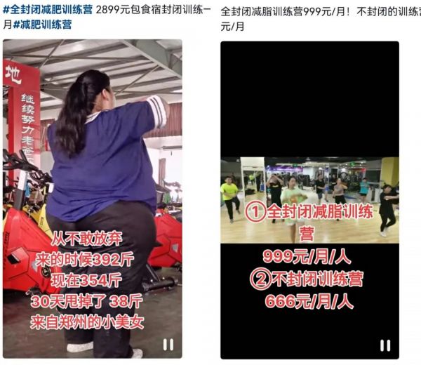 正如徐琳和何可所说,燃财经在抖音、小红书等社交平台看到,打着“28天减肥蜕变”、“3000元/月包吃住”旗号的减肥训练营数量众多,且机构遍布全国。