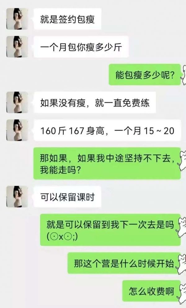 当燃财经询问“我现在150斤,想减重到120斤,一个月可以吗?”时,该销售顾问避重就轻地回答:“减重30斤的话,1-3个月都有可能,建议先报一个月的课程试试看。”当感觉到燃财经对减肥时间和减肥斤数有所犹豫后,该销售则迅速转变了话风,“签约包痩,一个月15-20斤”,并承诺“如果没有瘦,就一直免费练。”