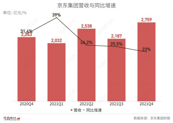 3月10日晚,京东集团发布2021年Q4及全年财报,Q4营收同比增长23%至2759亿元,略高于市场预期的2749.28亿元;归属于普通股股东的净亏损为52亿元,远超市场预期的0.65亿元,去年同期为净利润243亿元。