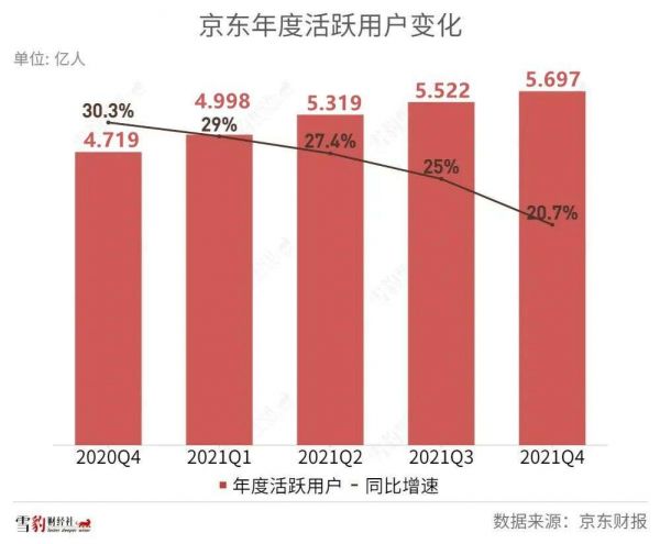 更为不利的是,烧钱换用户的成效开始明显下降。截至2021年年末,京东5.7亿的用户规模较市场预期少了1000万,也未能完成自己在2021年定下的新增1亿用户的目标。