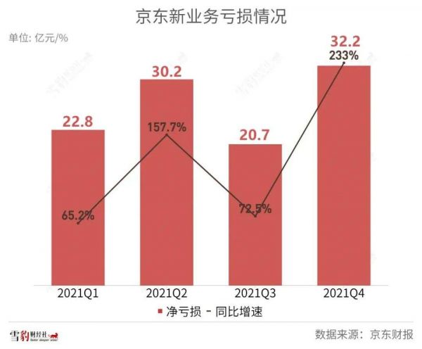 新业务不但在Q4亏超32亿元,整个2021年已累亏近106亿元。其中,主打社区团购、下沉市场的京喜可能是亏损的祸首。这部分业务是公认的烧钱大户,比如美团在美团优选、闪购等方面的新业务就一直持续亏损,2021年前三季度已亏损近282亿元。