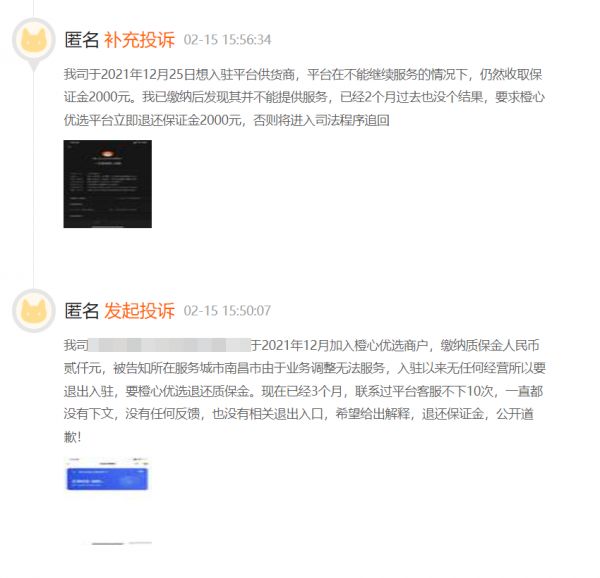 根据该商户的投诉信息,其于2021年12月加入橙心优选,并缴纳保证金人民币2000元,却被告知所在服务城市南昌市由于业务调整无法服务,入驻以来无任何经营业绩,所以要退出入驻,并要求橙心优选退还保证金。然而3个月过去,联系过平台客服不下10次,一直都没有下文,没有任何反馈,也没有相关退出入口。