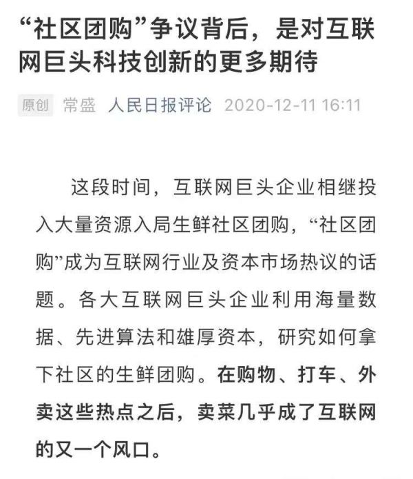 这其中重要原因之一是国家对于社区团购业务的认知和定位,早在2020年9月,面对狂热烧钱打价格战的社区团购企业,市场监管总局就直接出台了规定,要求不得“低价倾销”,当年12月份,人民日报更是发文喊话互联网企业,“别只惦记着几捆白菜、几斤水果的流量,科技创新的星辰大海、未来的无限可能性,其实更令人心潮澎湃。”
