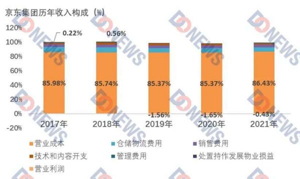 长期以来,京东一直维持着低利润率运营,但主要是由于其商业模式较重,而并非缺乏市场竞争力。下图为DoNews整理的京东集团历年营业收入构成,可以看到,其营业成本一直在85%以上,而营业利润最近三年都为负,2021年实际较前两年已经有所改善。(非美国通用会计准则下2021年京东的经营利润率为1.4%)