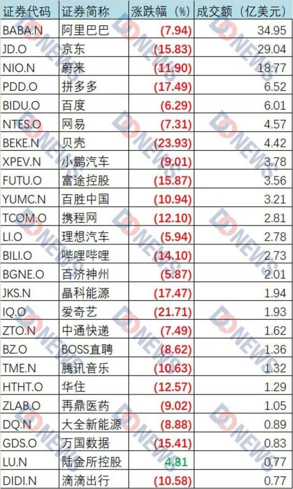 DoNews整理了目前280支中概股周四的市场表现,足有210支股票下跌,如果从当天的成交额来看,下跌的中概股更是占到了中概股总成交额的98.5%。按成交额排名前25的中概股中,仅有陆金所控股维持了近日来的上涨趋势,其余24家全部下跌乃至暴跌,并囊括了阿里巴巴、京东、拼多多、百度、网易、滴滴等中国互联网巨头,以及蔚来、小鹏汽车、理想汽车等新能源车企和携程、B站、爱奇艺等互联网公司。