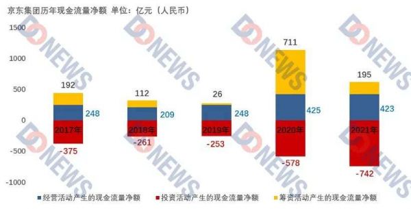 通过整理京东历年现金流可以发现,京东投资活动产生的现金流净额在2021年达到了742亿人民币(一季度完成了对中国物流资产和达达的收购),目前其账上依旧有767亿的现金及等价物。即使京东集团2021年经营活动产生的现年流净额较去年停止增长,筹资活动产生的现金流净额较去年的711亿也是大幅减少,但是一段时间内不会出现现金流短缺的的困难。