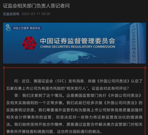 对此,我国证监会相关部门负责人表示,尊重境外监管机构为提高上市公司财务信息质量加强对相关会计师事务所的监管,但坚决反对一些势力将证券监管政治化的错误做法,始终坚持开放合作精神,愿意通过监管合作解决美方监管部门对相关事务所开展检查和调查问题,这也符合国际通行的做法。